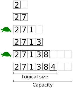 Let’s say you start by adding value 2 and then 7 etc,. See how the capacity of the ArrayList grows when the size equals capacity. This is called as doubling capacity approach, where when you have filled the ArrayList with values to its fullest capacity, it immediately doubles the capacity and copies the previous content of values into the new list. This will lead to empty holes in the new ArrayList.